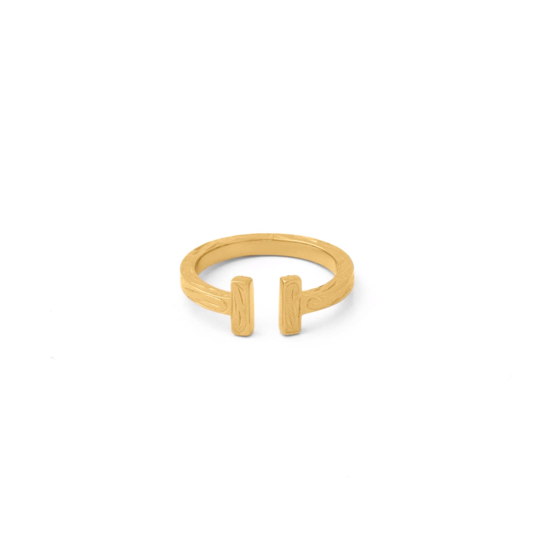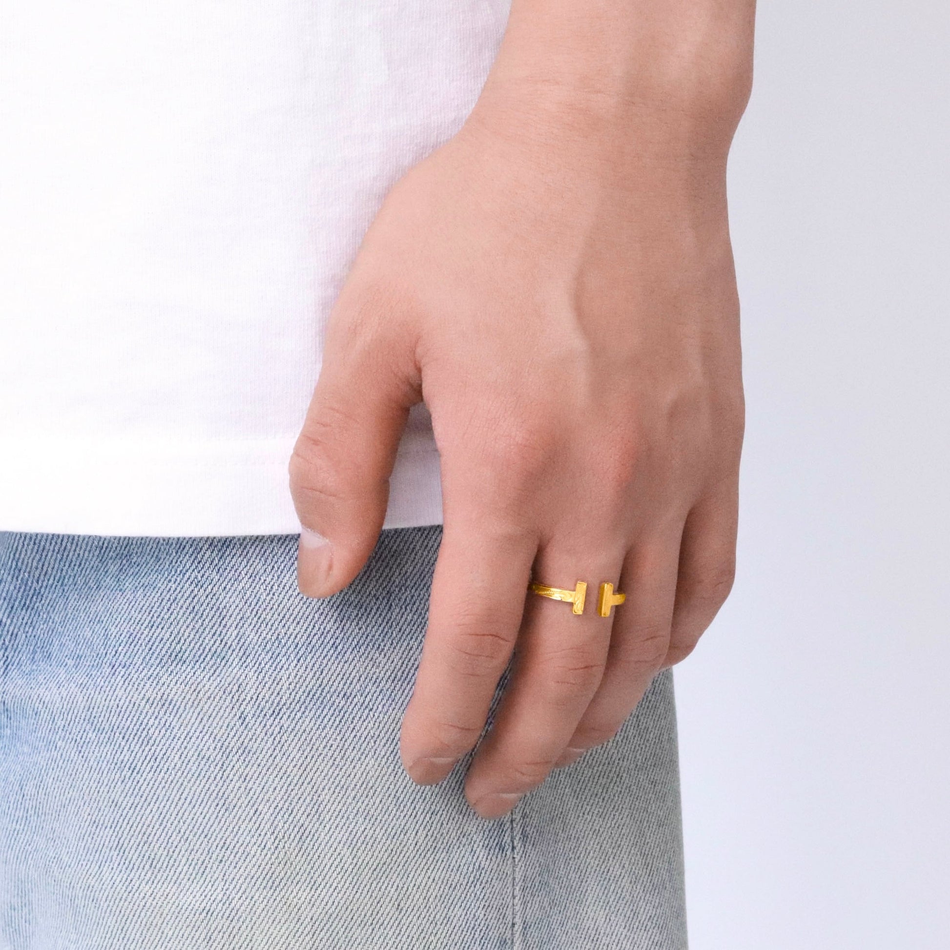 シンプルなサークルリングにTバーを向かい合わせたデザインで、