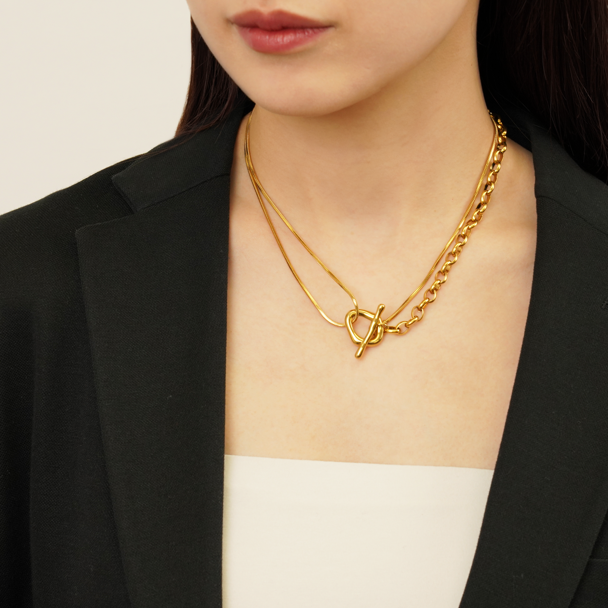 2種類のチェーンを半分ずつ使用した個性的なネックレスです。