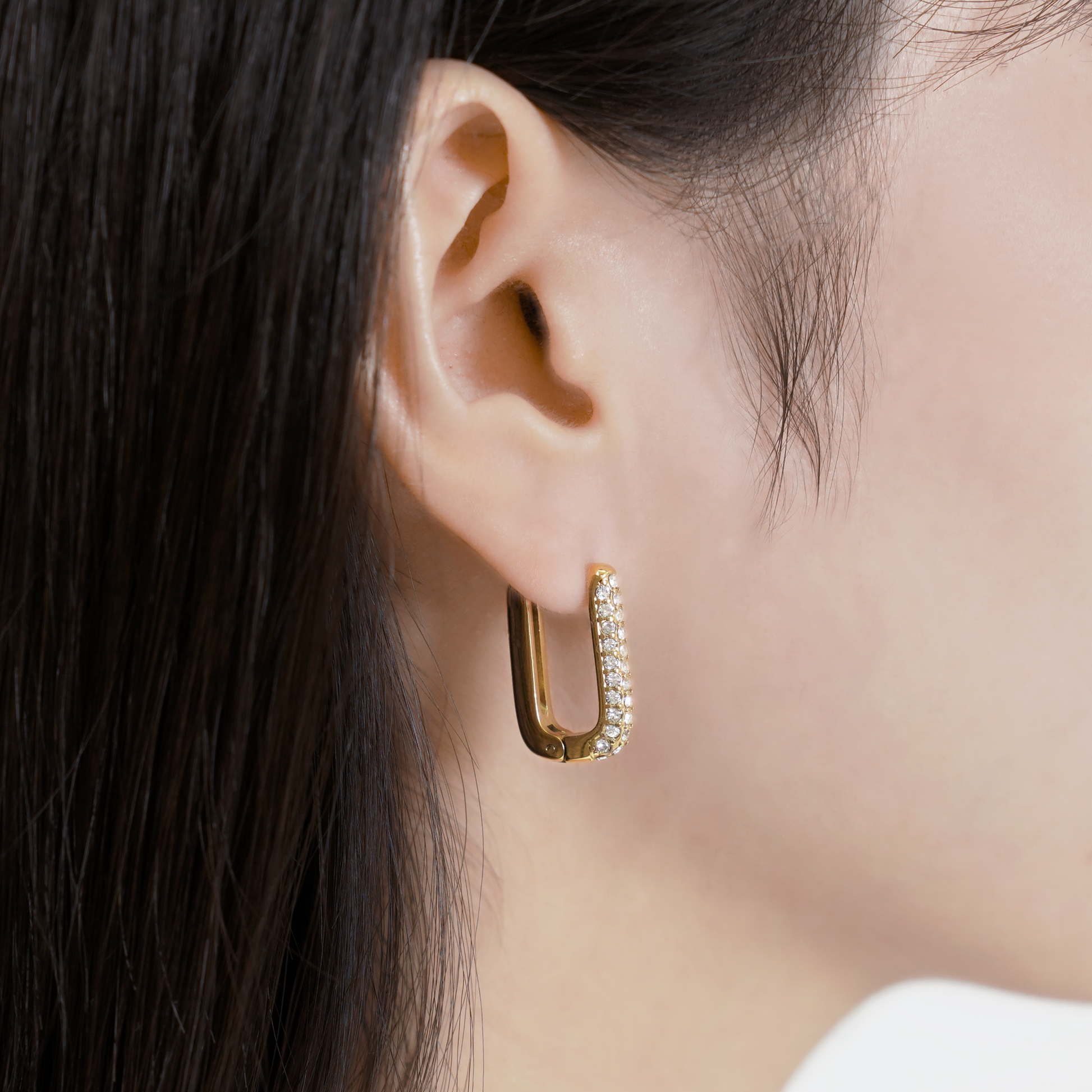ジルコニアをふんだんに敷き詰めたスクエア型のフープピアス。