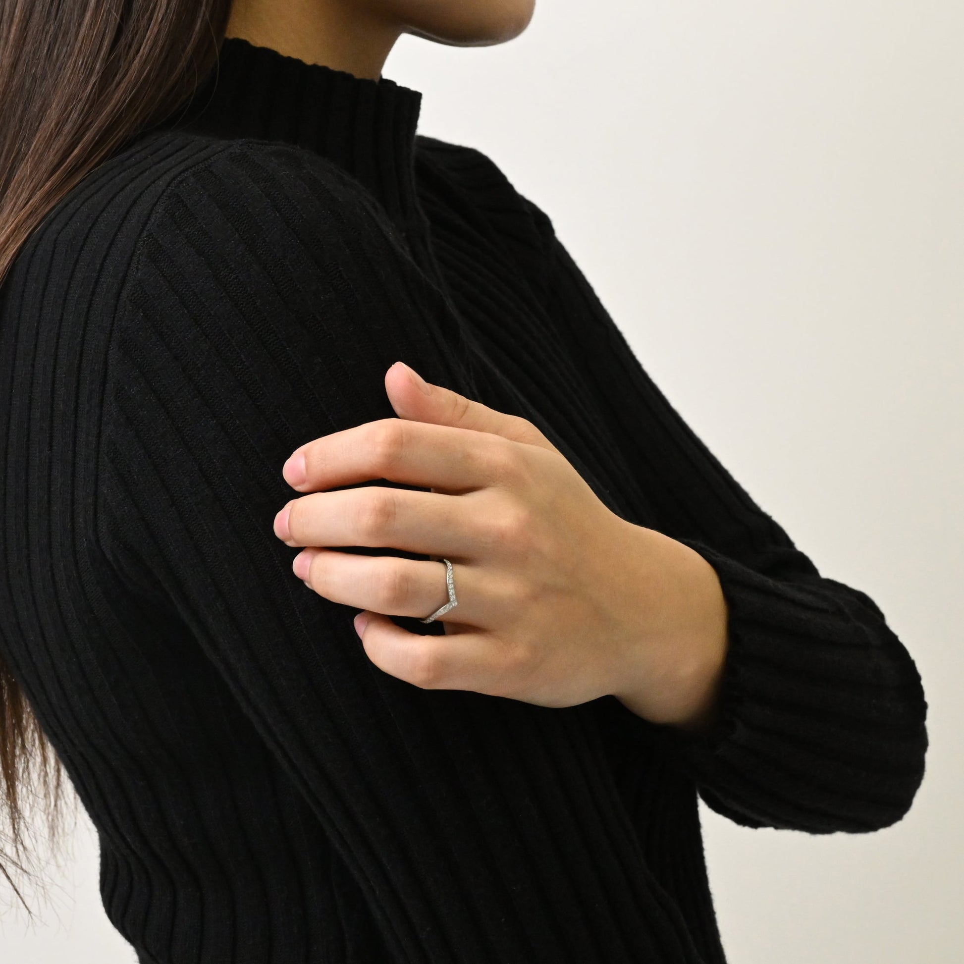 指を細く長く見せてくれる、V字デザインのリング。