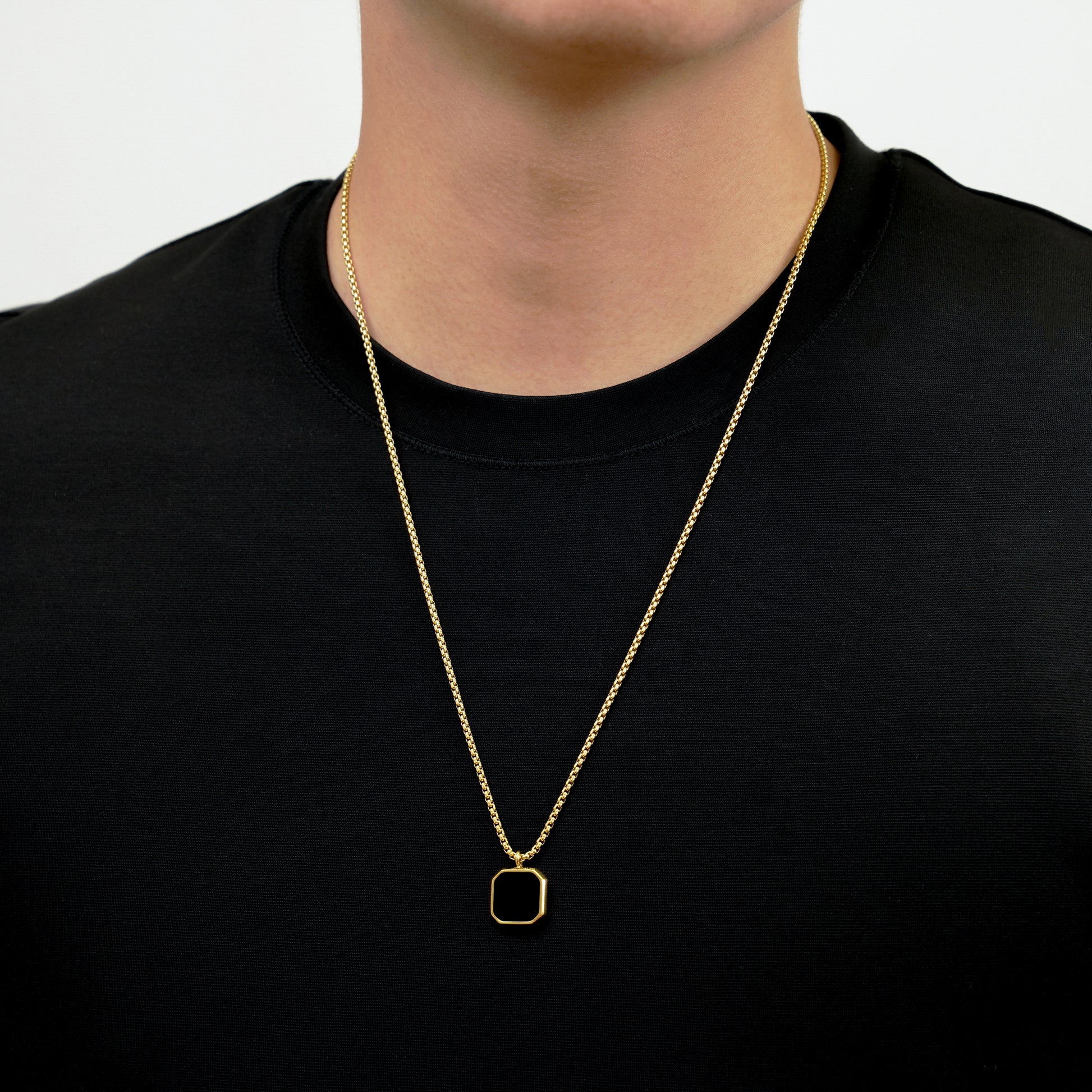 漆黒のスクエアチャームが印象的な、洗練されたペンダントネックレス。