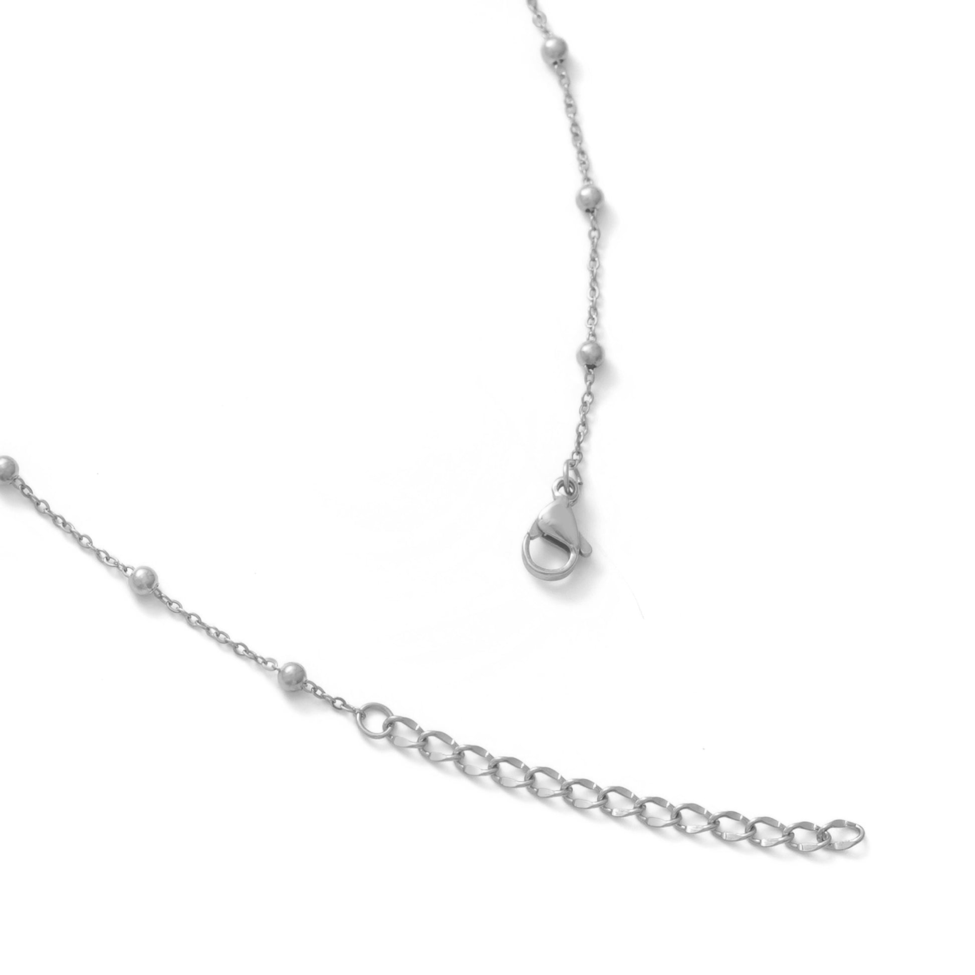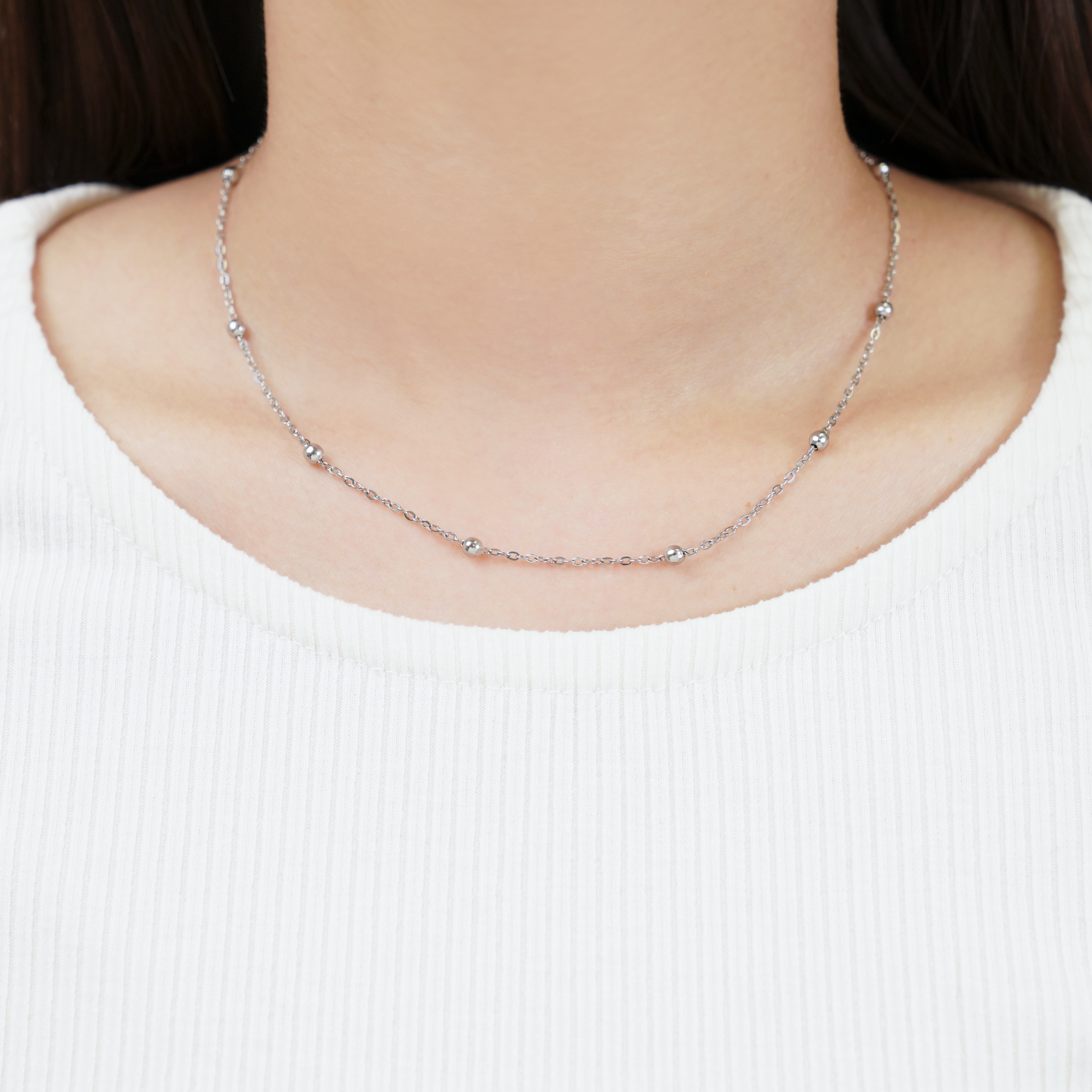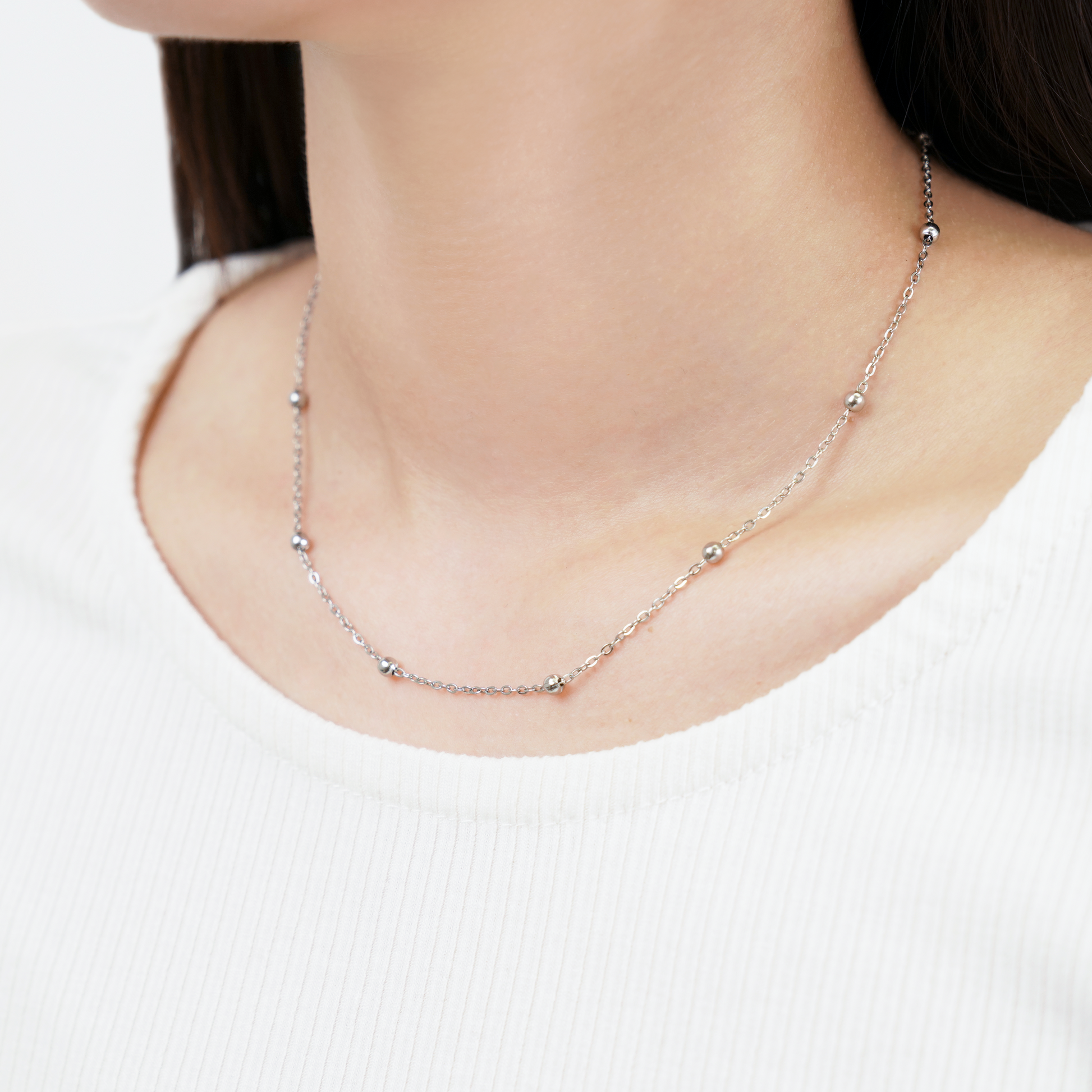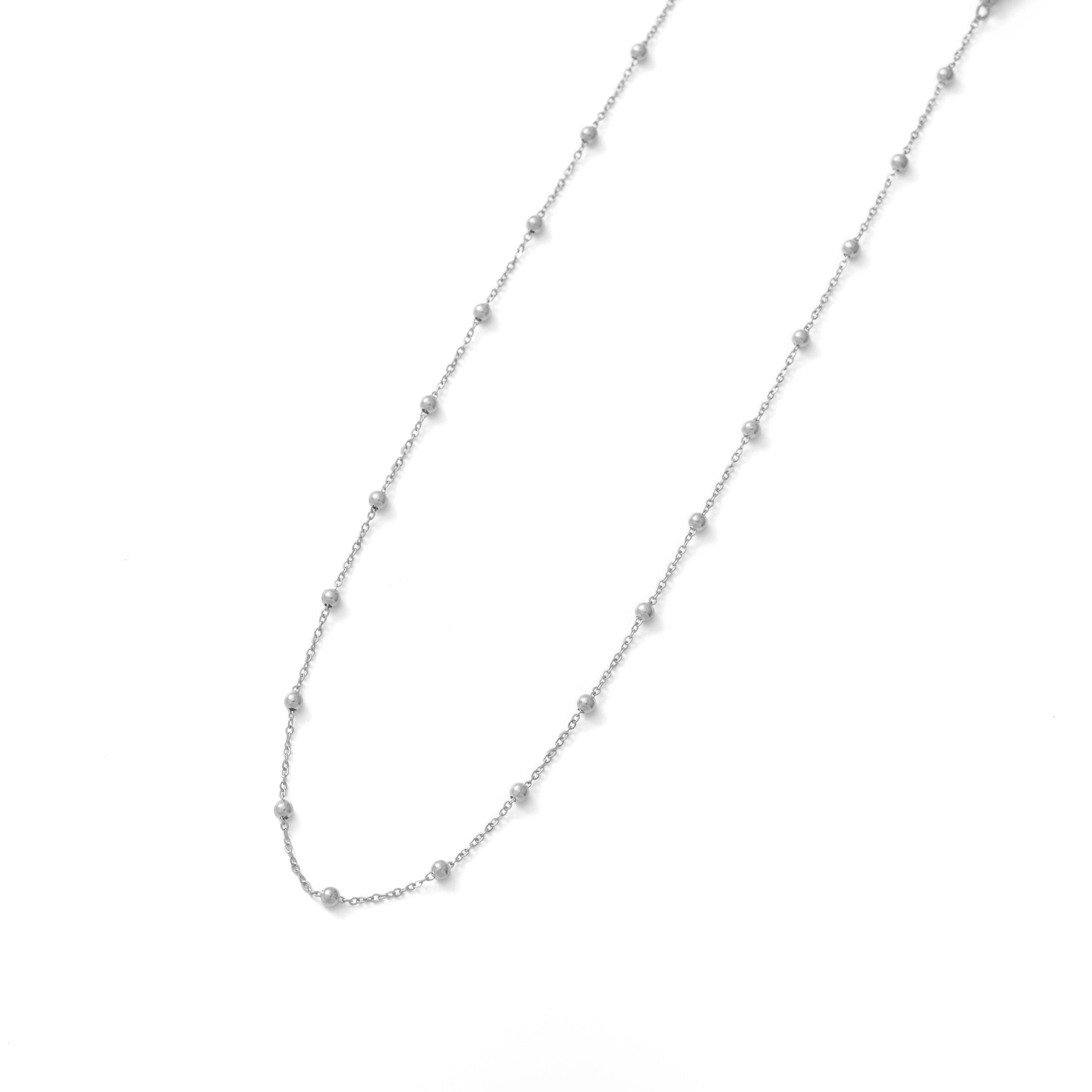 等間隔に配した小さなメタルボールが、ミニマルなチェーンにリズムを生むネックレス。