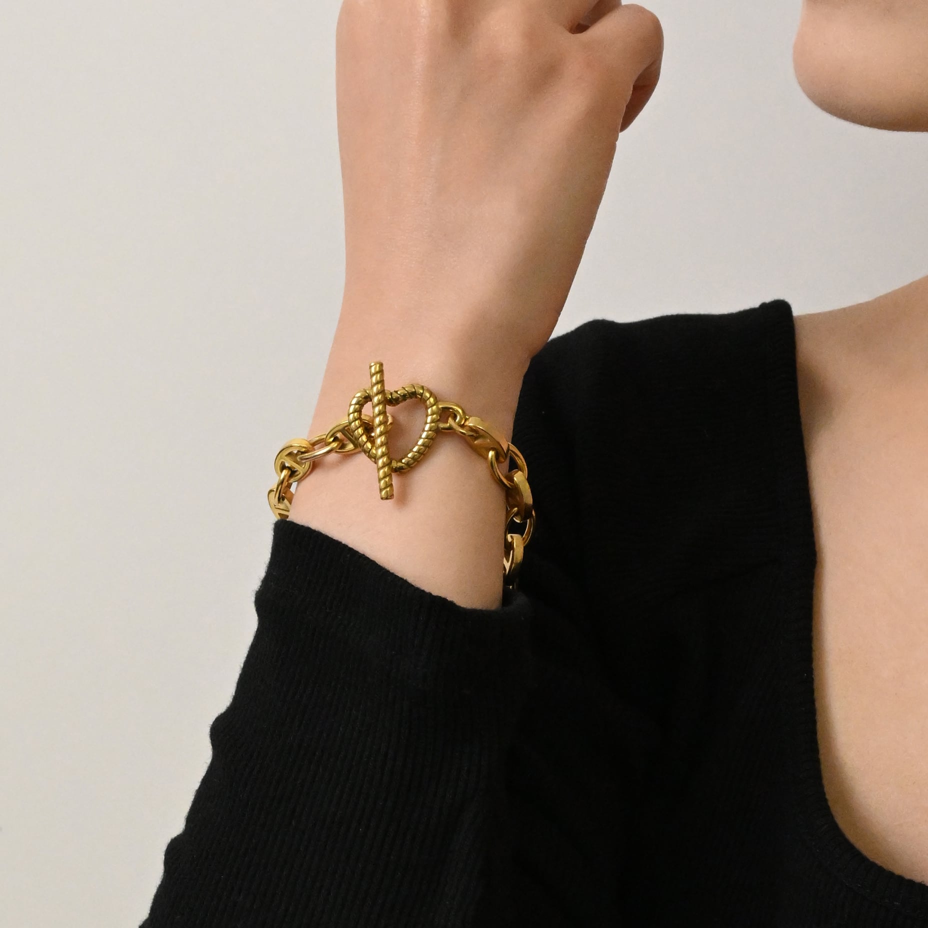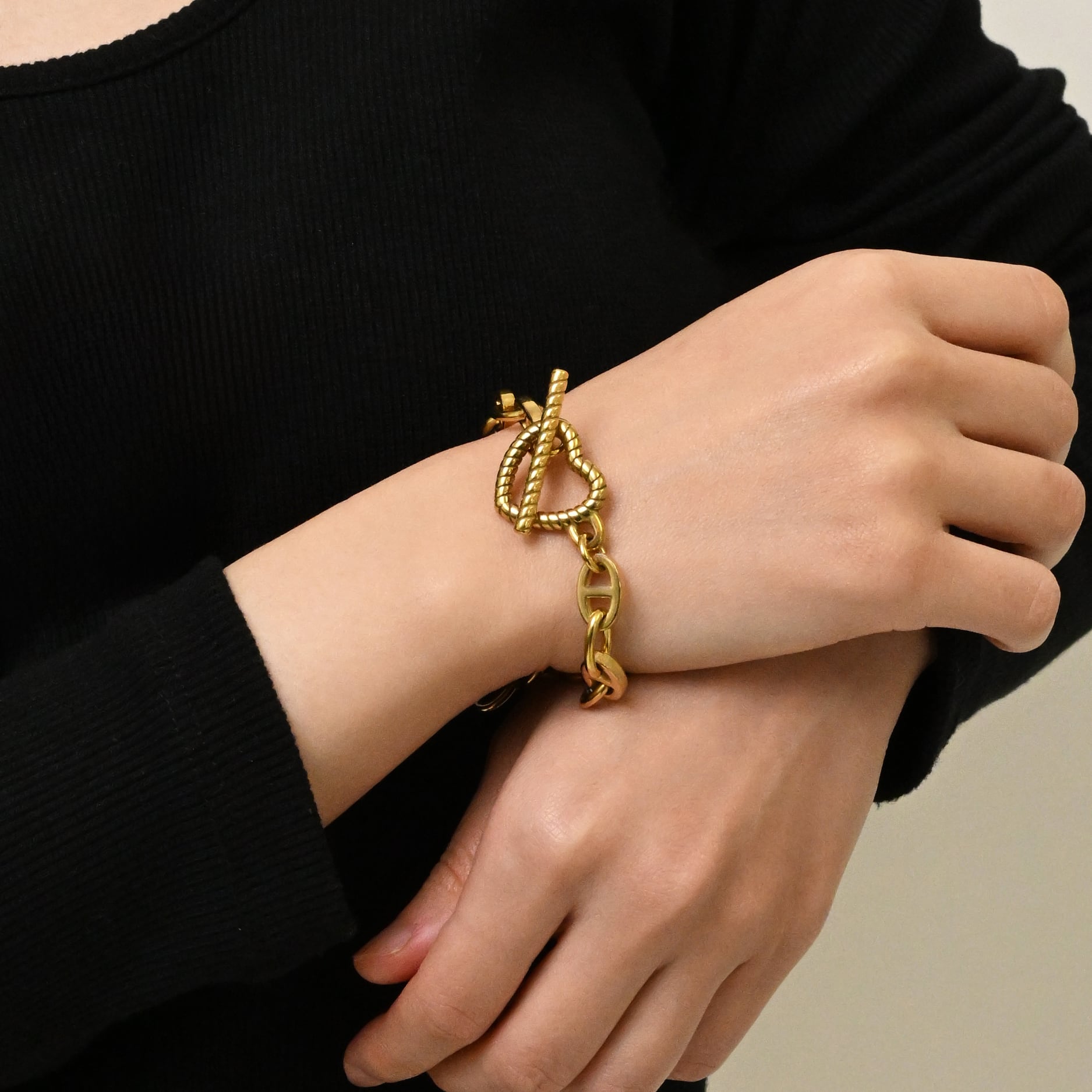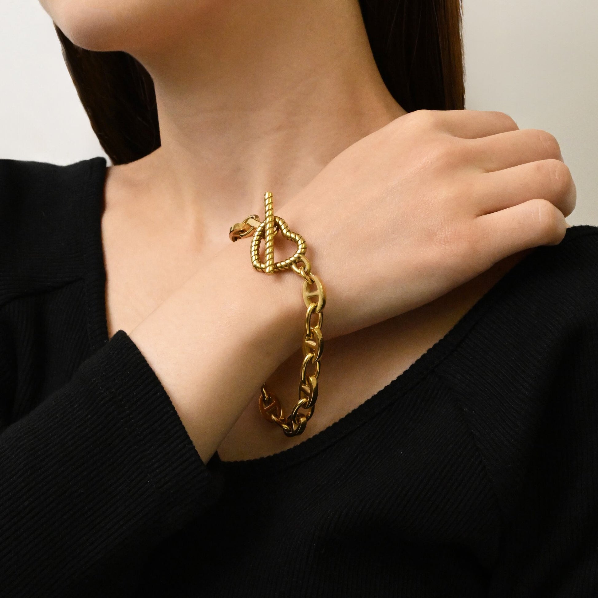 心をアンカーで繋げるような意味を込めたハートのチェーンが、装いに華やかさをプラスしてくれます。