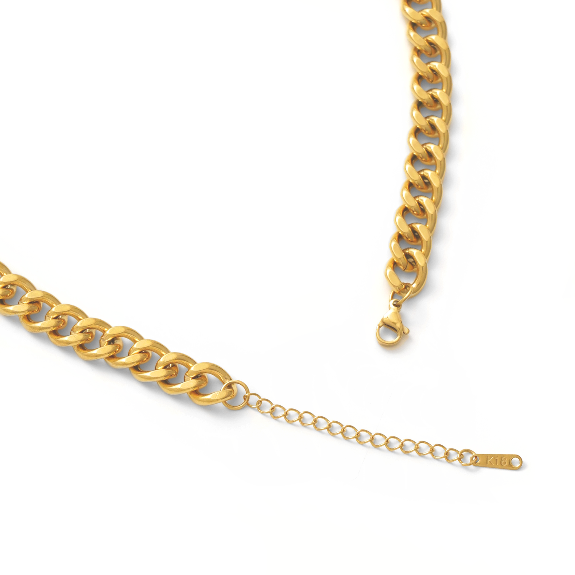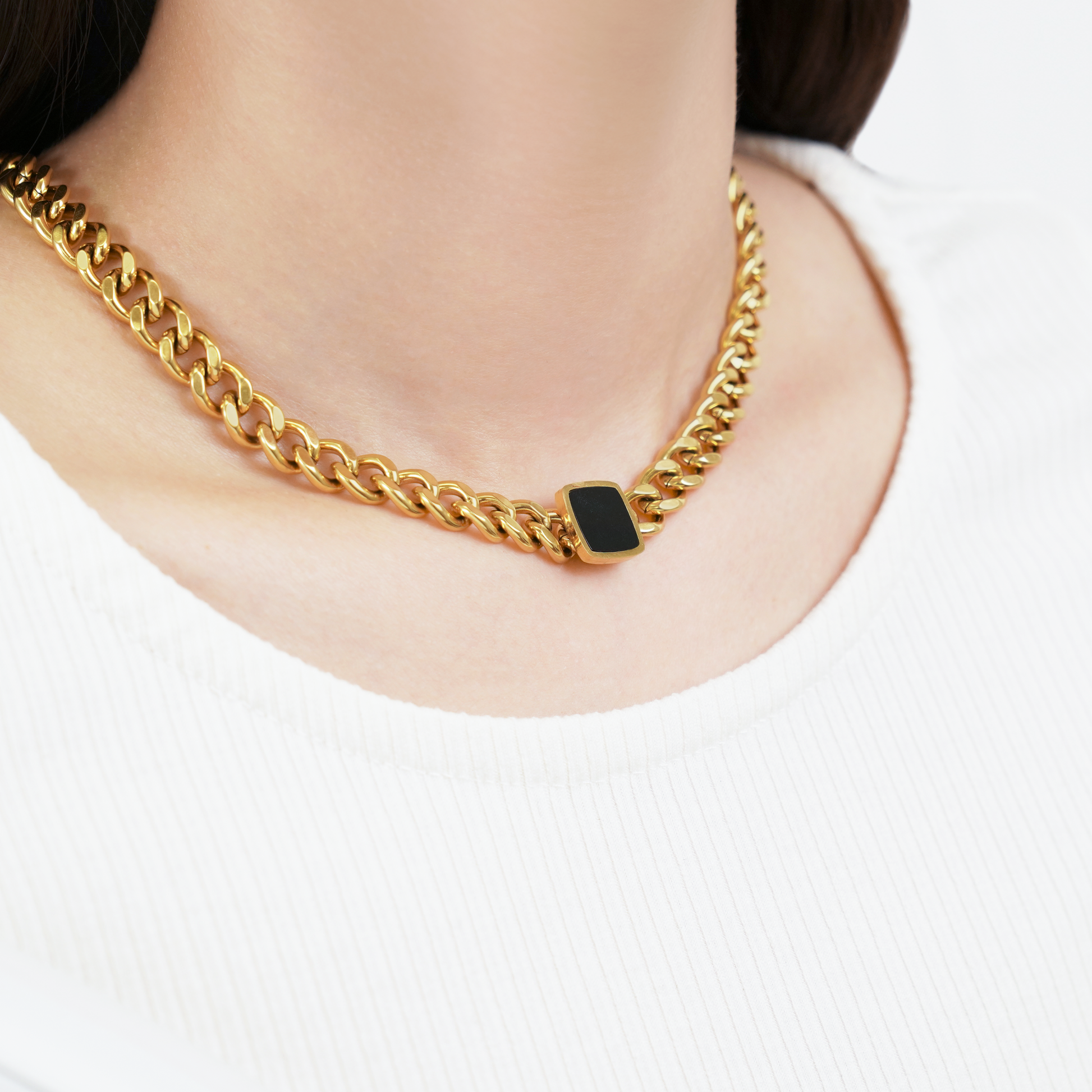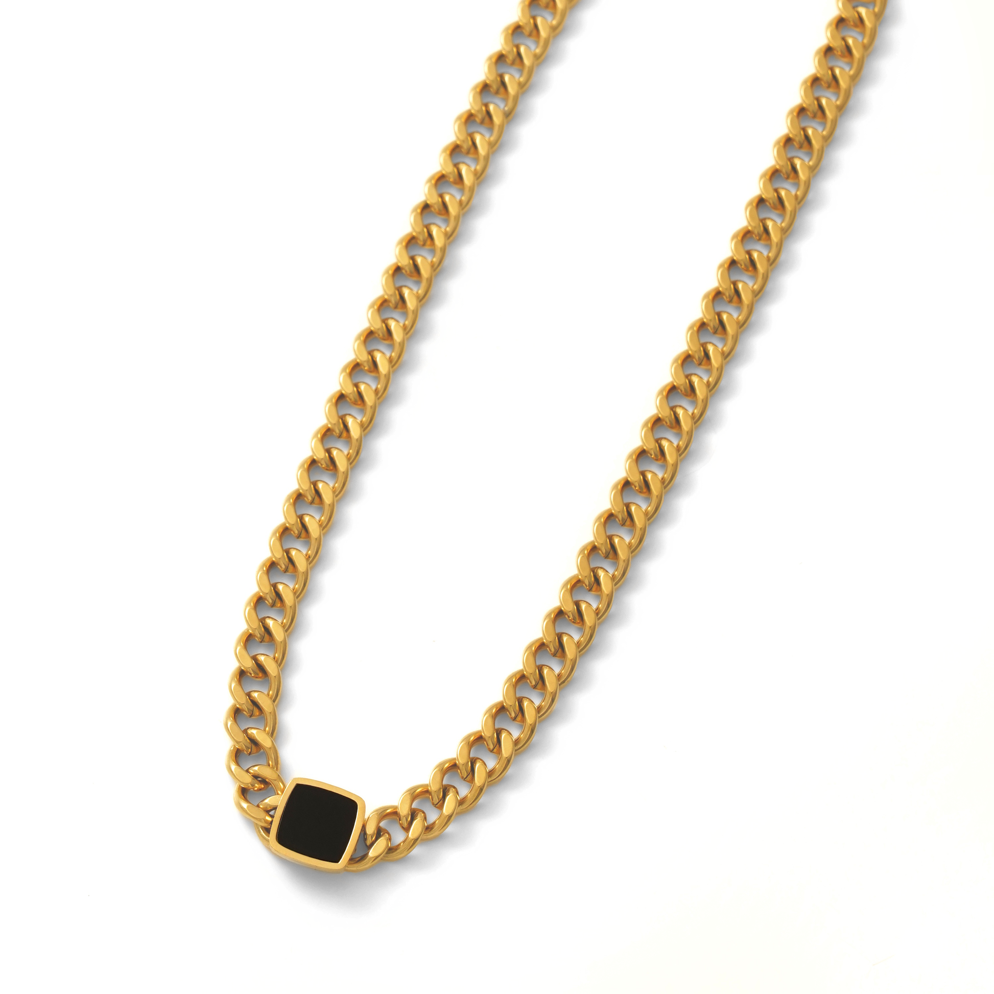 重厚感のあるボリュームチェーンに、シンプルながら存在感のあるスクエアパーツを配したネックレス。