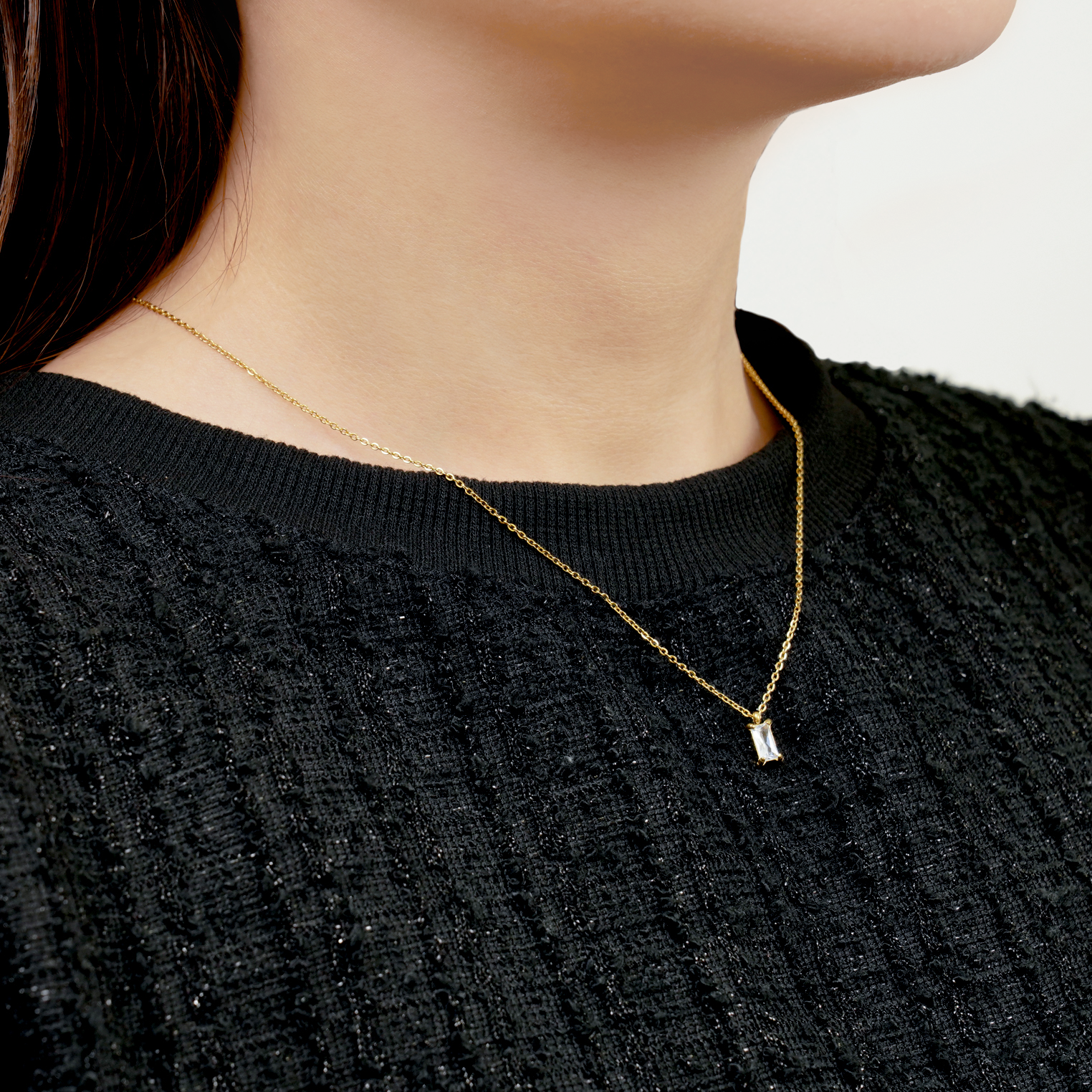 スクエアカットのジルコニアが胸元にすっきりとした印象を与えてくれるネックレス。