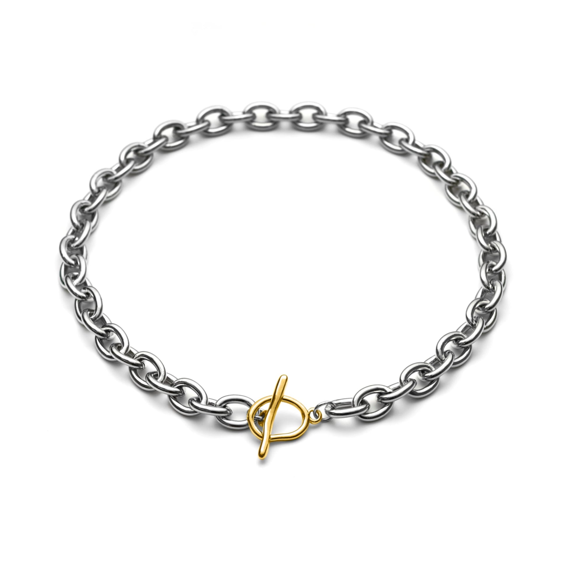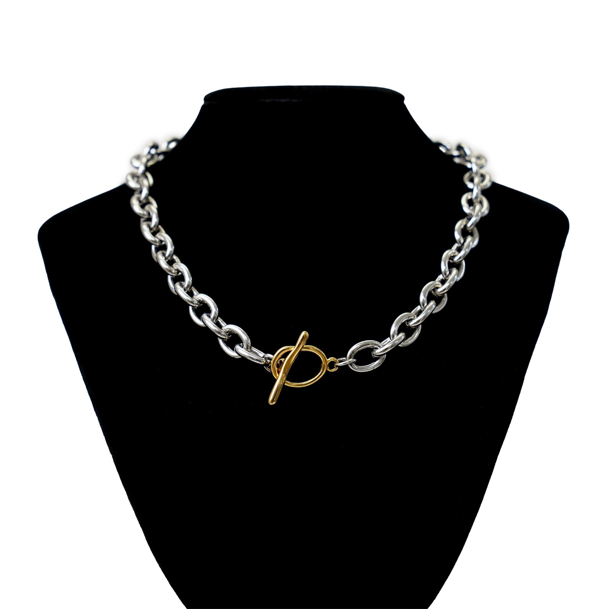 エッジを効かせた留め具部分の仕上げは光の陰影を演出してくれます。丁寧に研磨されたチェーンはツヤ感たっぷりで派手すぎず、コーデ全体が高見えします。
