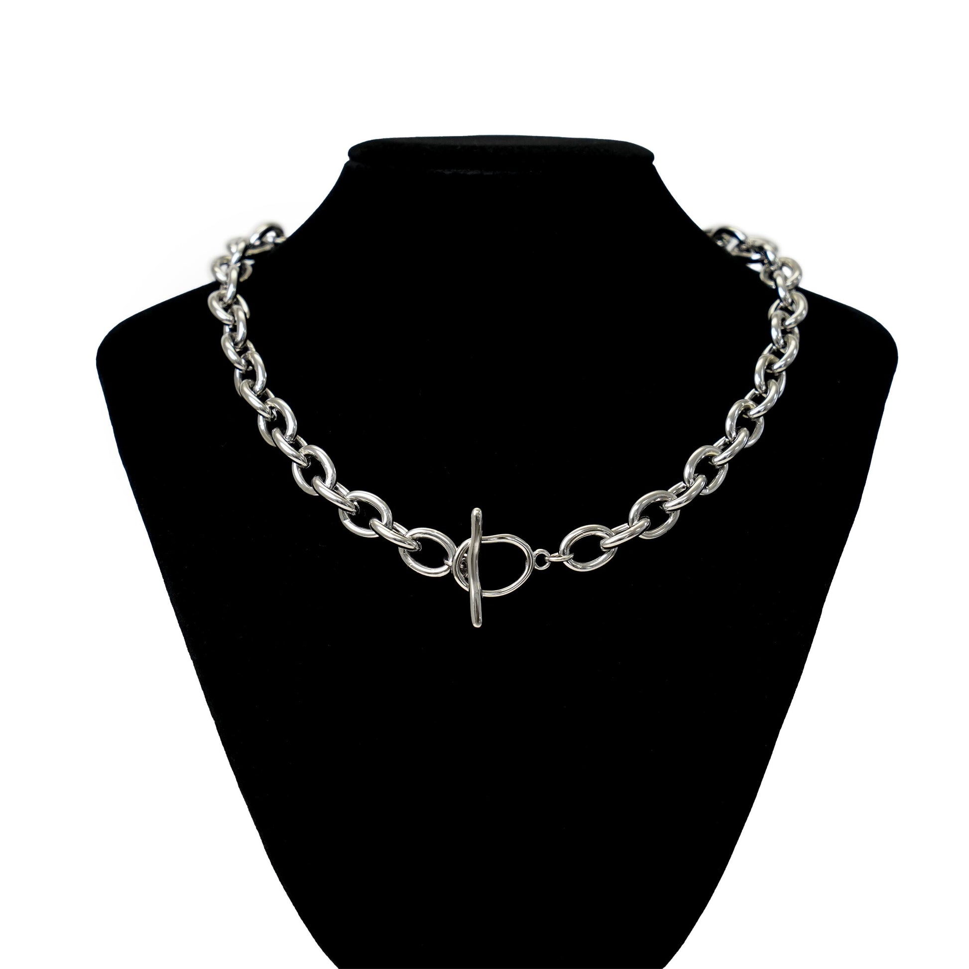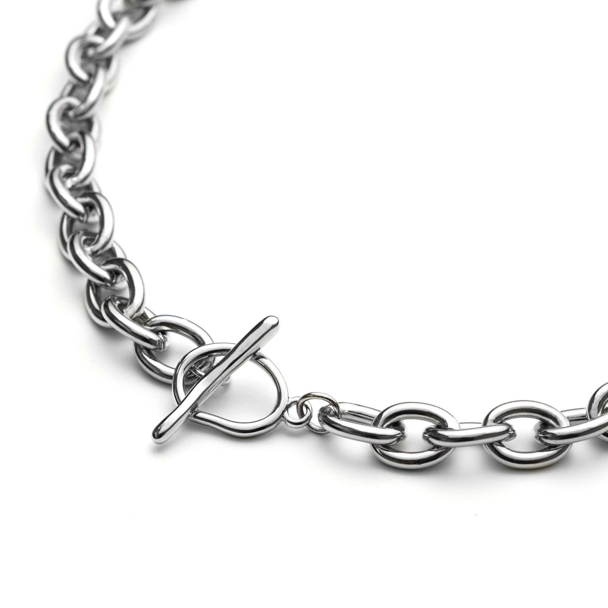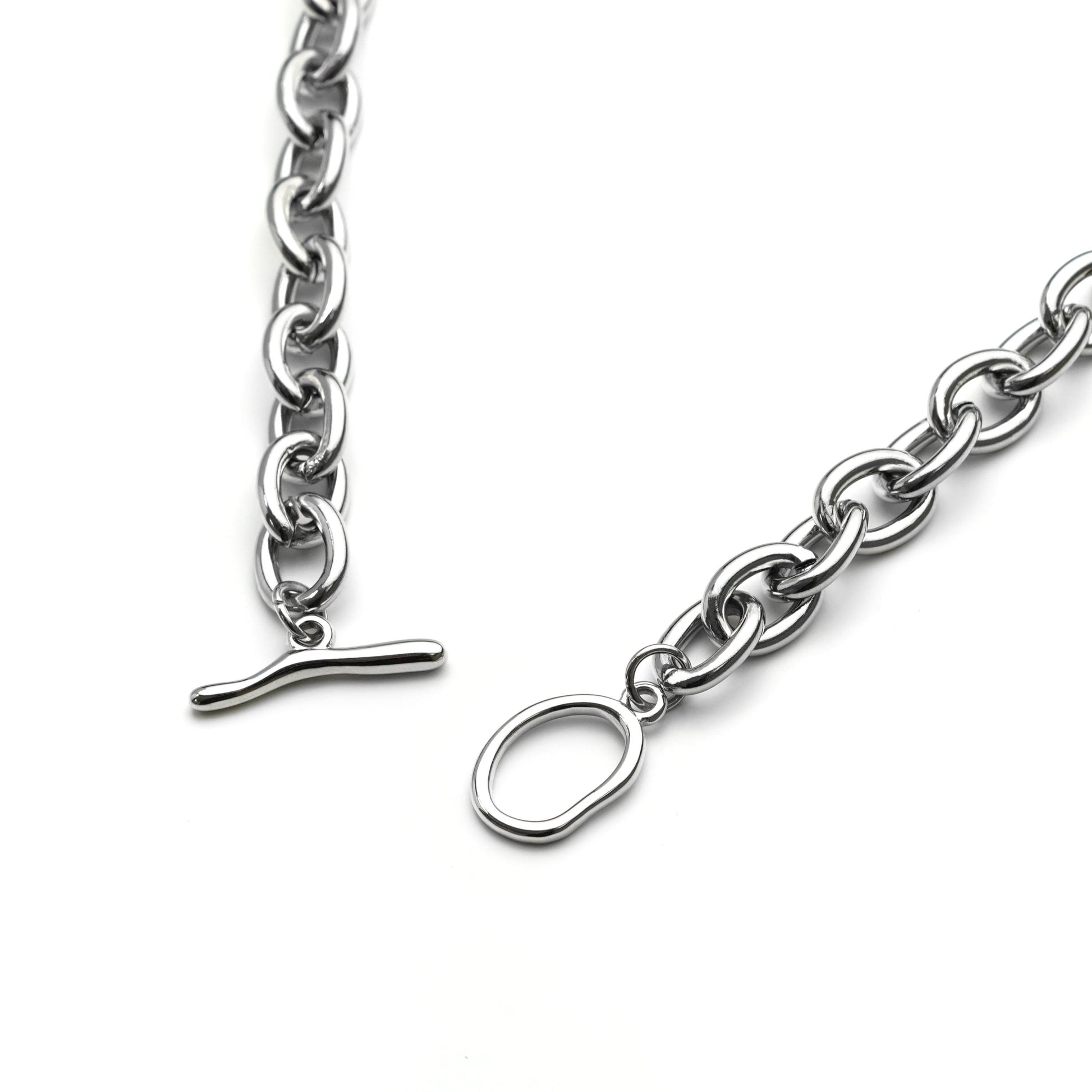 エッジを効かせた留め具部分の仕上げは光の陰影を演出してくれます。丁寧に研磨されたチェーンはツヤ感たっぷりで派手すぎず、コーデ全体が高見えします。