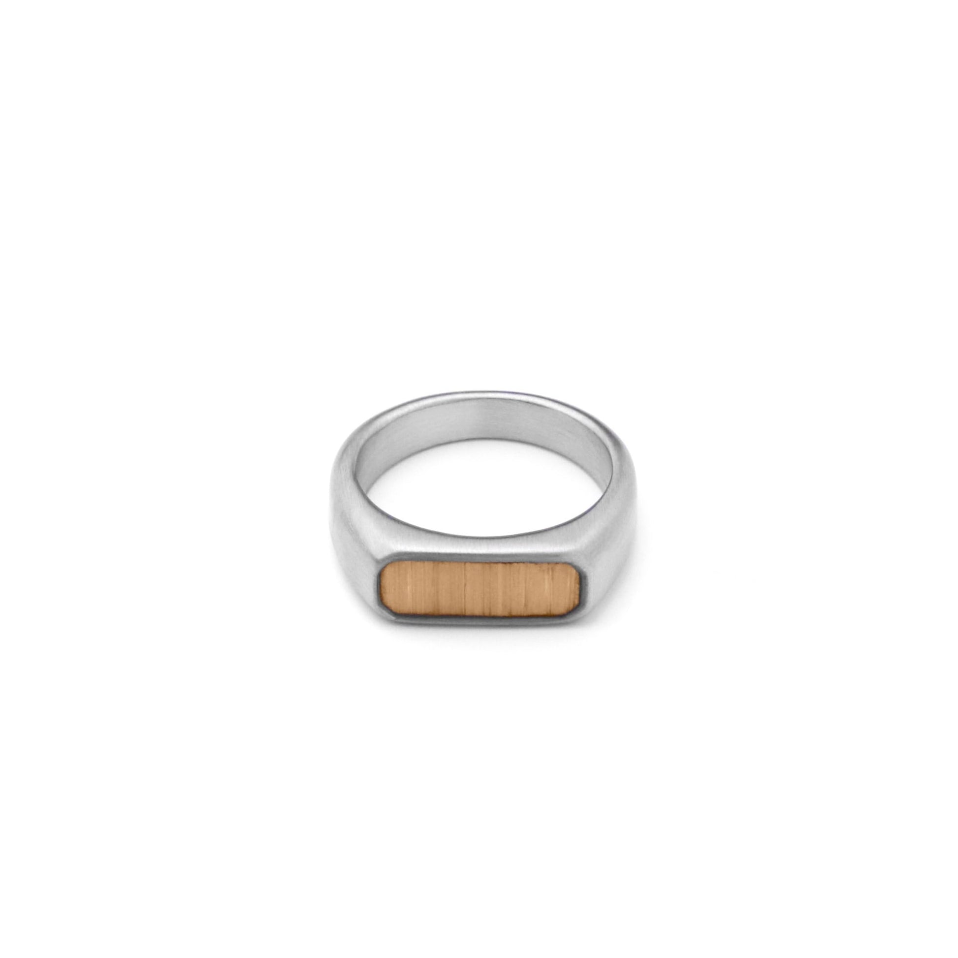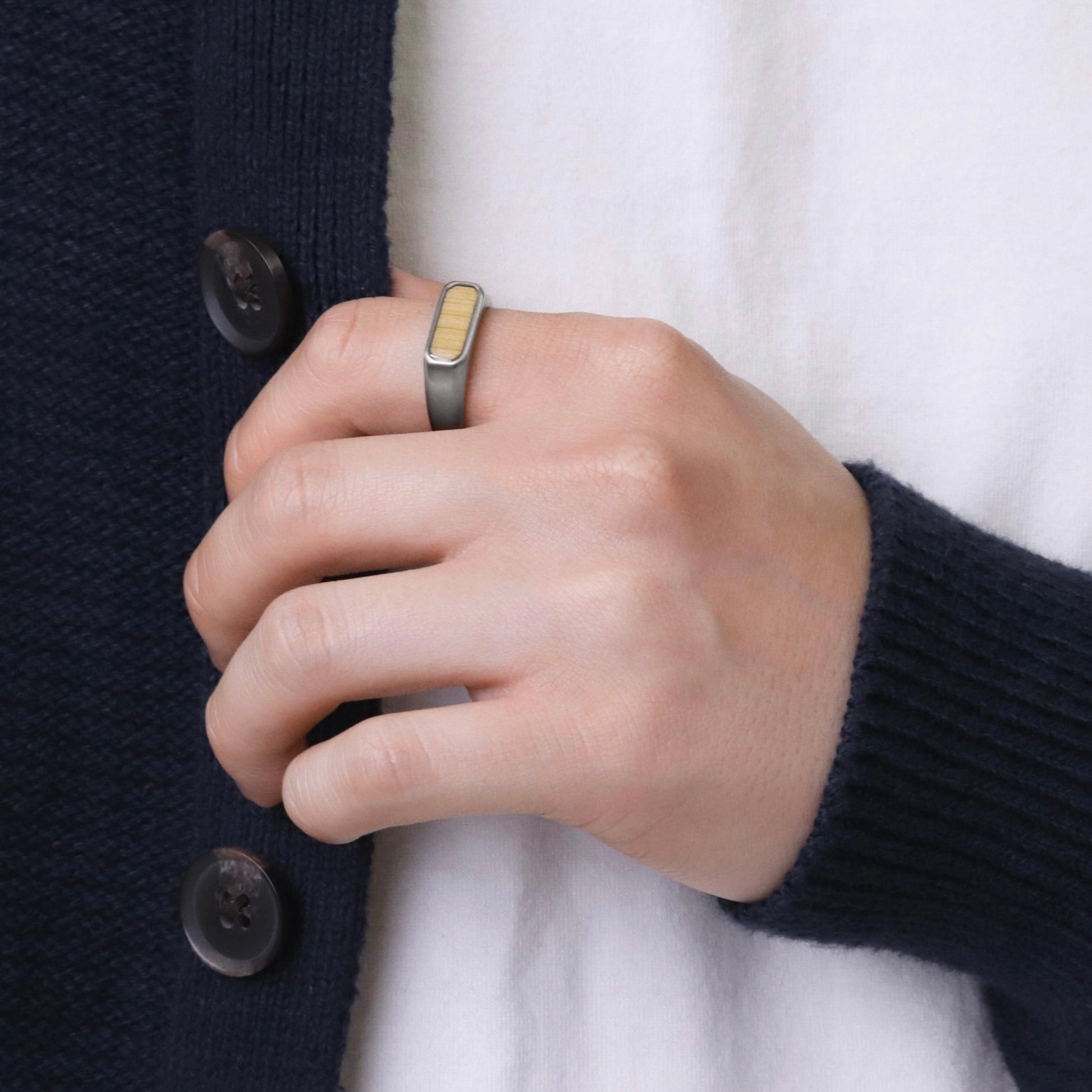 ウッドスリムシグネットリングはスモールサイズのシグネットリングです。リング中央には木の温もりを感じさせてくれる木目のウッドパネルをセットし、リング表面には艶消し加工を施しておりますので輝きも落ち着いていて、着けやすくアクセサリーに初心者の方にもおすすめです。