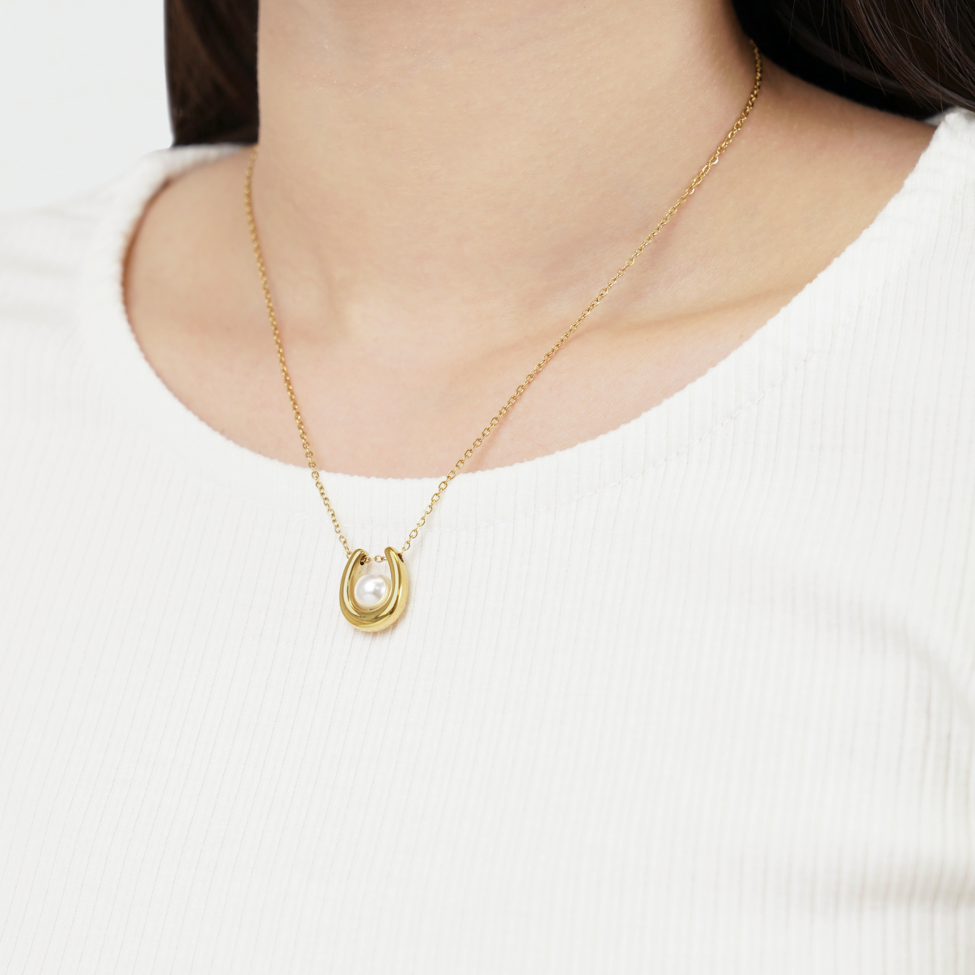 幸運を呼ぶモチーフとして知られる馬蹄に、上品なパールをあしらったネックレス。
