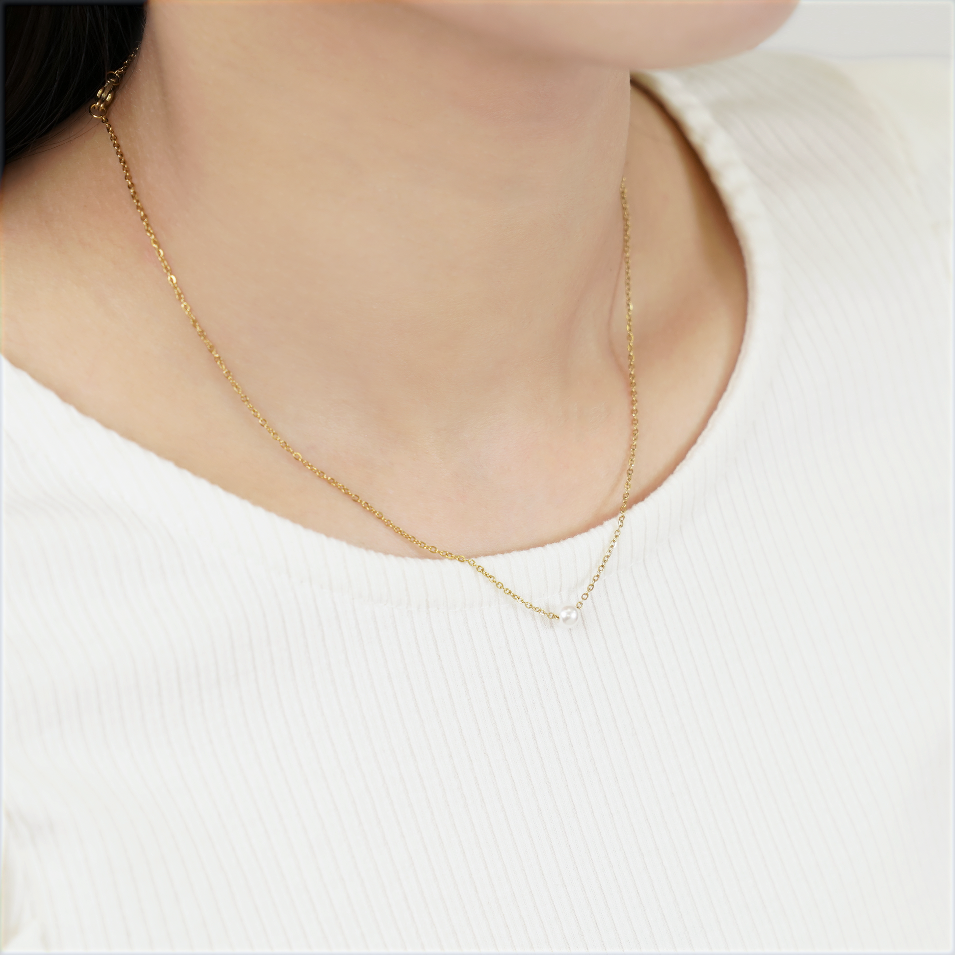 一粒のパールが首元で上品に輝くシングルパールネックレス。